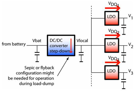 我们若采用开关稳压器作为输入级,再以多个低压降稳压器提供输出,便可减低电源供应系统的整体成本。高功率的电源供应系统甚至必须采用这样的设计。图 4 是其中一个示例。