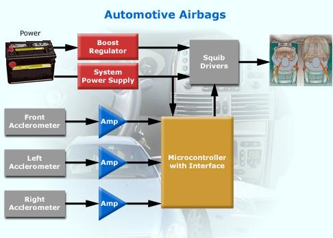 即使是小型的汽车目前都设有 6 个气袋,而且所采用的安全标准要求极高。负责为气袋充气的是一款称为爆发驱动器的特别芯片。这款确保汽车安全的芯片必须能够在撞车的紧急关头时立即启动。按照图 2 所示,气袋系统基本上由多个部分组成。