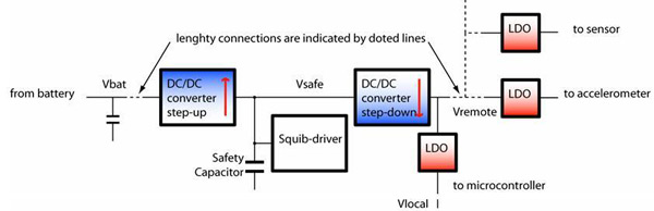 LM9076 稳压器芯片则适用于更高温的操作环境,其接面温度可高达 150C。这款稳压器可利用 8 伏的输入电压输出 150mA 的电流及 5 伏的电压。在额定的操作温度及负载范围内,这款稳压器芯片可以保持极高的输出电压准确度 (高达 2%)。由于这个结构采用了安全电容器,因此操作时更为安全可靠。从成本的角度看,采用远程低压降稳压器无需加设任何散热器,因此有助节省成本。由于 Vsafe大于Vbat (最高值),而一级转换器可用作升压转换器,因此无需采用布局较为复杂的 sepic 2 或回扫式 3 的转换器。降压转换器适用于降压稳压器,后者成本也较低。由于低压降稳压器无需利用高压电源,因此有多种不同的 CMOS 或低电压双极芯片可供选择。