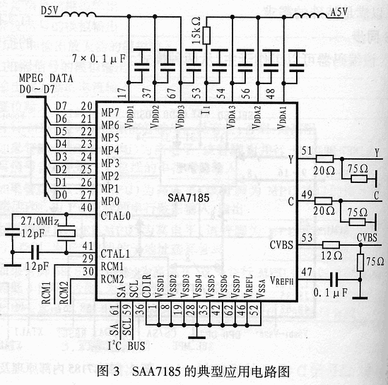 图3是SAA7185的一个应用电路。其中电路的模拟和数字电源均为5V。该电路为 VCD小影碟机和多媒体电影解压卡中常用的数字编码电路,系统中的输入数据可以是16比特YUV方式,也可是CCIR656格式。图中输入的是8比特MPEG-1数据,采用与CCIR656兼容的方式。在该系统中,SAA7185编码器工作于主模式。